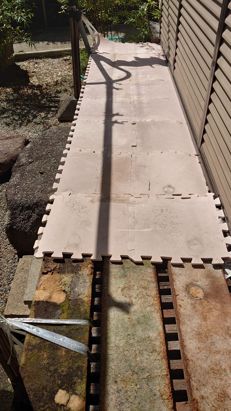 台風10号の影響で軒下に引いていたマットが飛びむき出しになった軒下